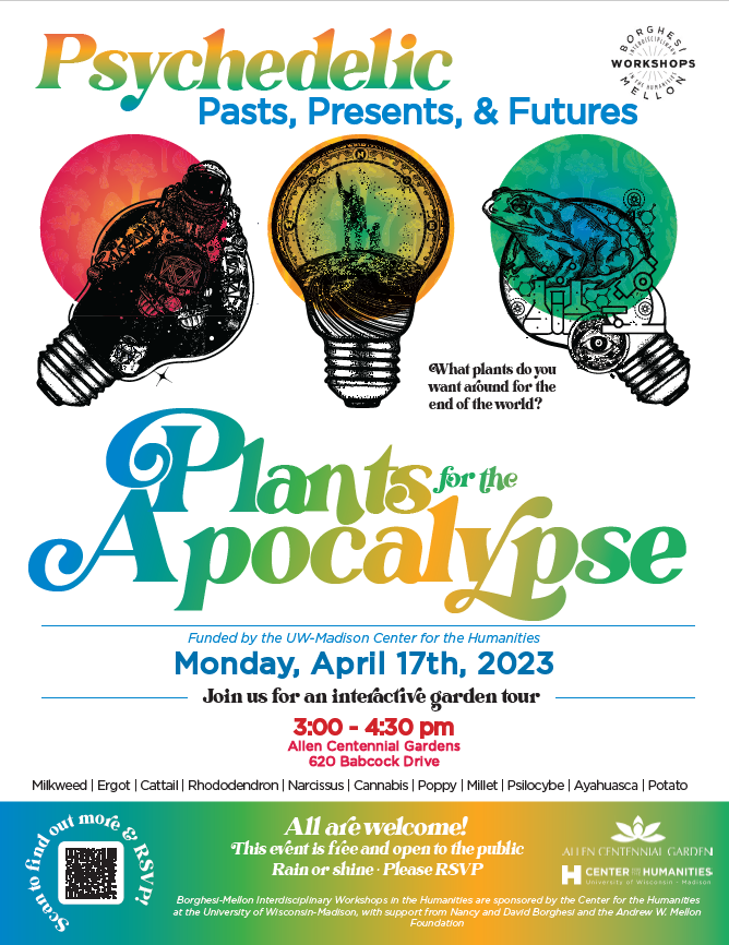 Plants are our partners in life and in death. They might signal the coming of the apocalypse, feed or heal us through extreme experiences, and help us cope with our mental health in challenging ecological times. We will explore plant relationships with apocalypse and their associations with death, war, famine, and plague. What kind of plants would you want around for the end of the world? Drop in to learn from UW community members about plants that have the potential to affect the health of people, the Earth, and our relationships.  It is also Environmental Histories Week, Bicycle Day, 420, and Earth Day, so we are nodding to those holidays, interdependence, and health!