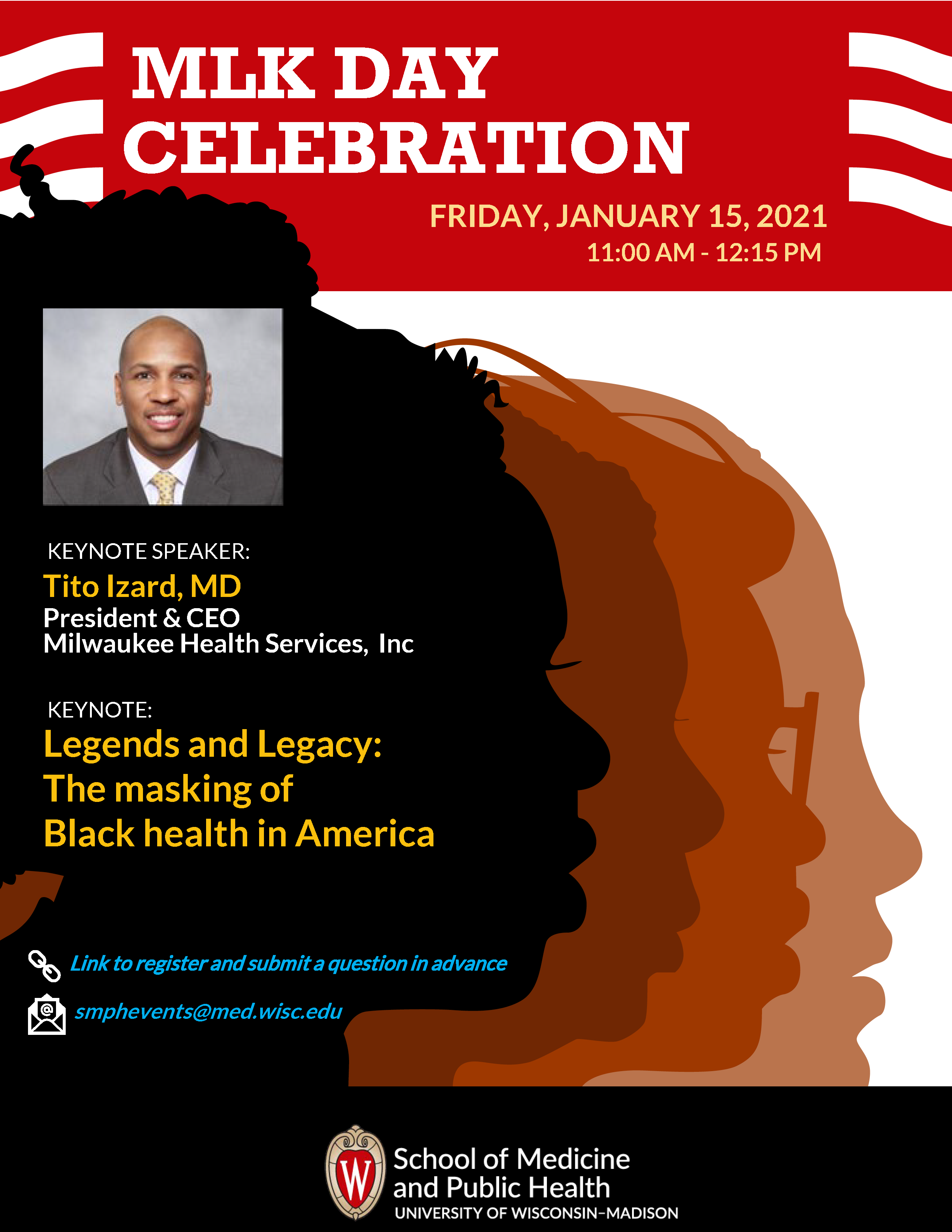Renowned UW School of Medicine and Public Health alumnus Tito Izard, MD ’96, will join us for a virtual event from 11 a.m. to 12:15 p.m. on Friday, Jan. 15 to honor Martin Luther King Jr. Day.