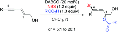 - “Intermolecular bromoesterification of conjugated enynes: an efficient synthesis of bromoallenes.”